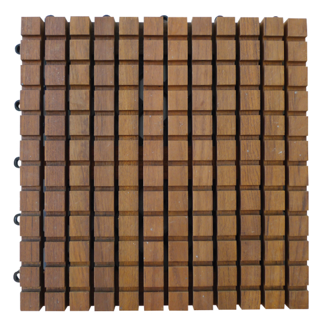 | ウッドデッキ 「チョコレートバー」は、小さいダイスのチョコレートがたくさん敷き詰められたようなデザインのデッキタイルです。1枚のタイルにたくさんのモチーフがあり、敷き詰めたときに継ぎ目が分かりづらく、広がりを感じるのも特徴です。 |