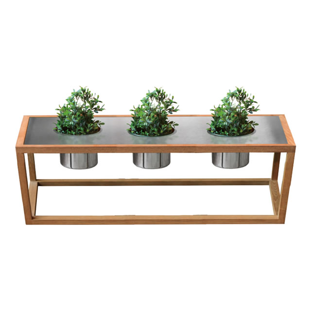 | エフプランターはミャンマー産天然チークとステンレスの調和を活かした、ジゼルが提案する新しい形のデザインプランターです。いくつかのタイプがある中、FP450は、シリーズの中でも最もロータイプのプランターで、3つの鉢を並べて配置しています。同タイプのプランターを並べて使うも良し、他の高さの違うタイプのプランターを組み合わせても良しと、使用環境に合わせてコーディネートが楽しめるシリーズです。 |