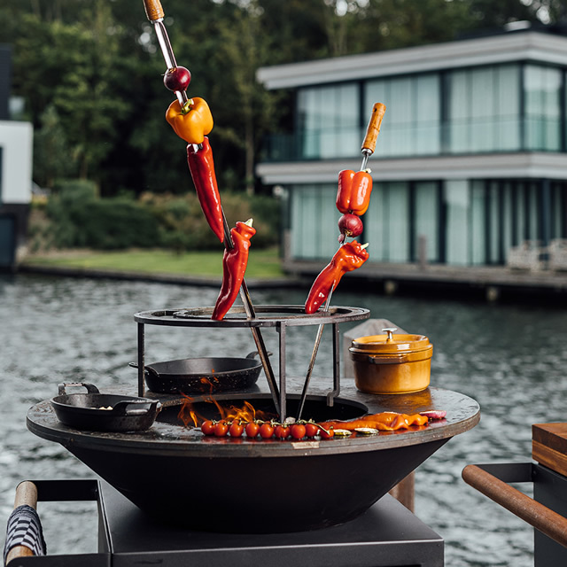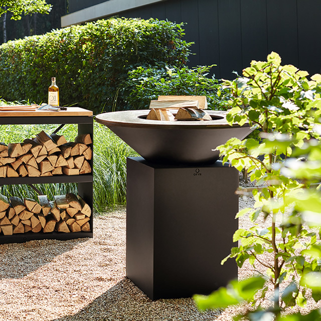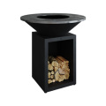 シンプル&ワイルドなグリルと、薪をストックできるストレージの付いた台のセット。グリルはφ850mmと1000mmからチョイス。
