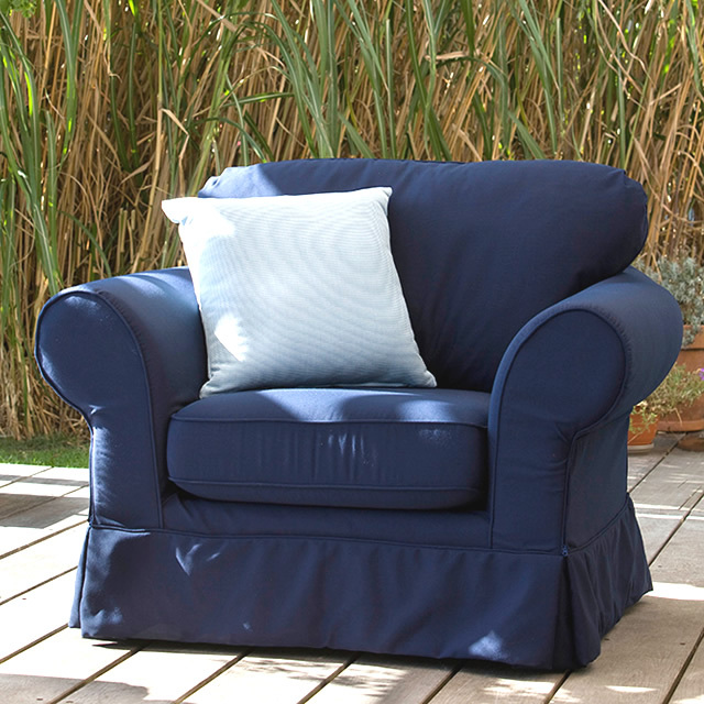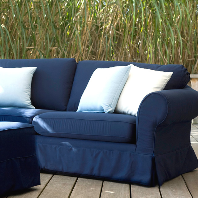 抗菌メッシュが張られたアルミニウムフレームをベースに、水を通す特殊な耐候クッション材 Eco Dry Foam®(エコドライフォーム)をふんだんに用いた構造で、雨水が下に落ちる設計になっています。また、スペイン製Agora®ファブリックは、マジックテープで簡単に取り外しができ、ホームクリーニングが可能です。