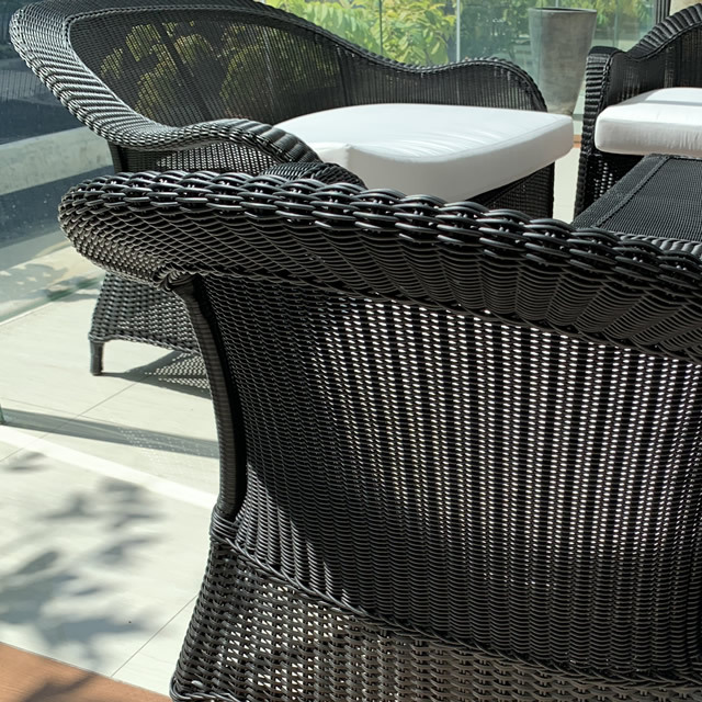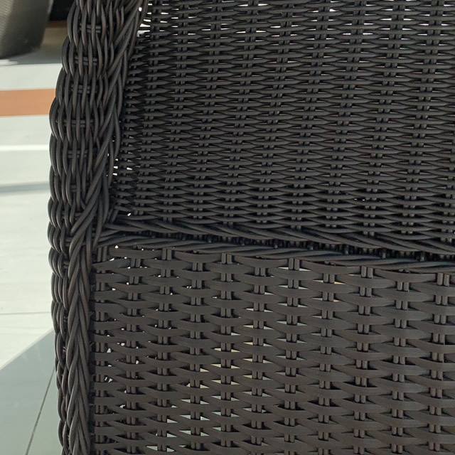 「新世代ラタン Durawera® デュラウェア」は、その耐UV性、耐候性、耐衝撃性から厳しい屋外環境での使用の中でも経年変化が少なく、天然のラタン(籐)よりも長持ちする特性を持ちます。また、この合成繊維は温度変化にも優れた耐久性を発揮し(-20℃から70℃)、年間を通して屋外でお使いいただくことができます。寒い日には編み目がつまり硬くなり、暑い日には編み目がゆるくなりますが、気温が安定してくると通常の弾力性に戻る特性を持ちます。
