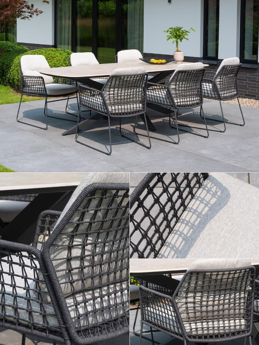 優雅に編み込まれたロープ模様が特徴のモダンなガーデンチェアー。背面クッションも付属し、長時間座っても快適なガーデンファニチャーです。