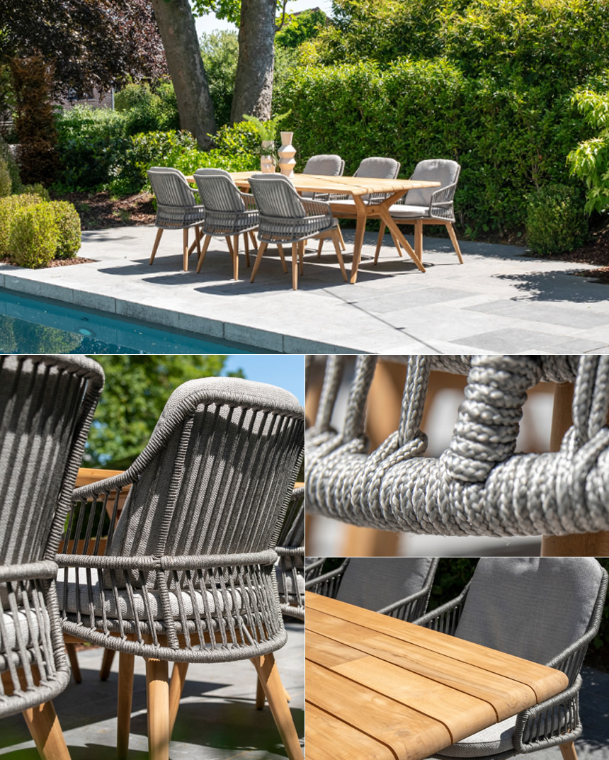 天然チークの足回りにオレフィンロープを縦格子状に編んだ、シンプルモダンなガーデンチェアー。シンプルなデザインながら背面クッションも付属し、長時間座っても快適なガーデンファニチャー。