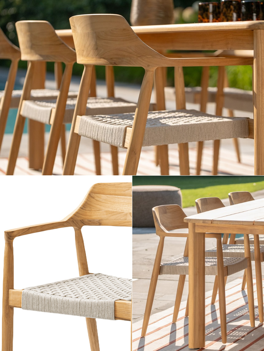 チーク材本来の魅力とロープ織りの芸術性を融合させたガーデンチェアー。屋外空間にスタイリッシュさと温かみを演出するユニークなガーデン家具です。
