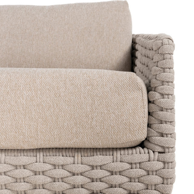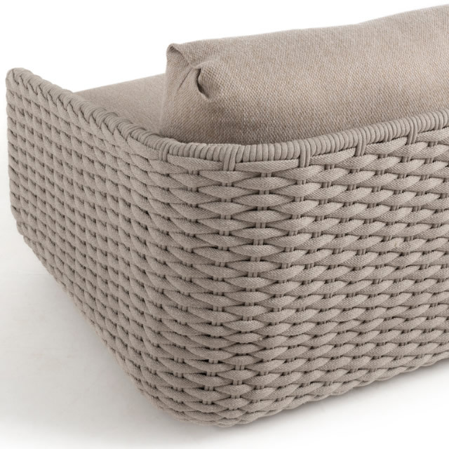 「CASANOVA(カサノバ)」のガーデンソファは、太めのロープでたっぷり編んだデザインが特徴で、飽きのこない長く付き合える雨ざらし可能なガーデンソファセットです。