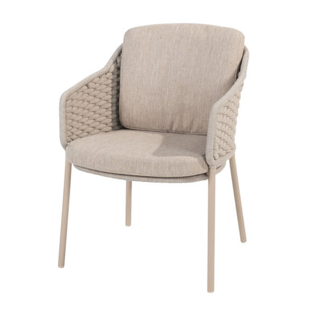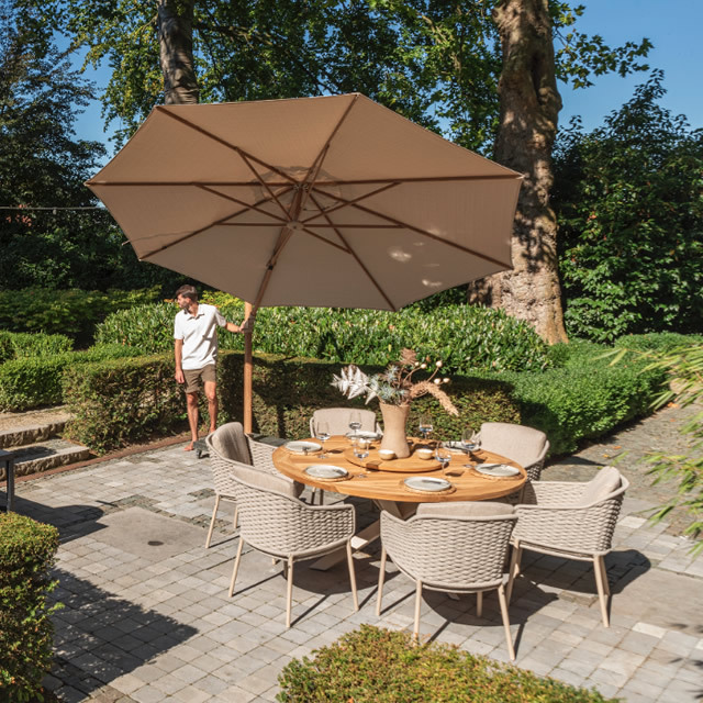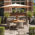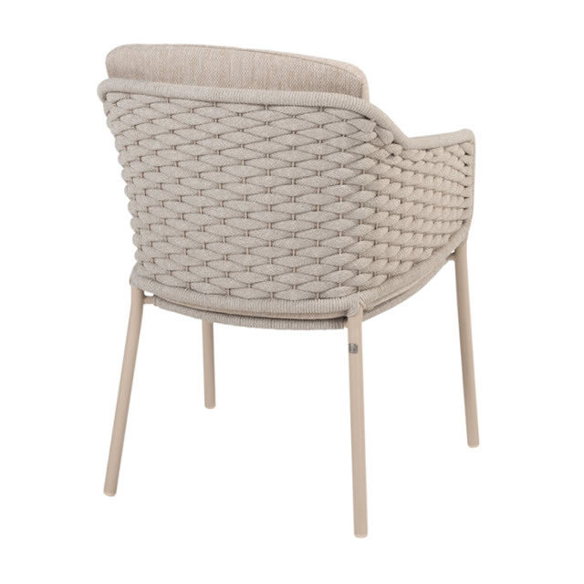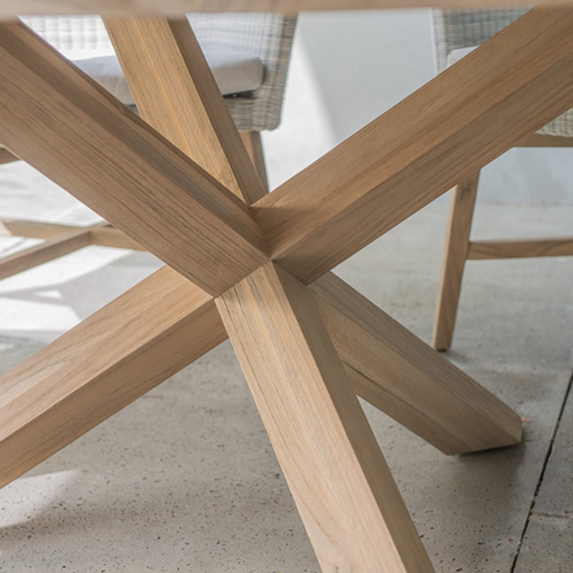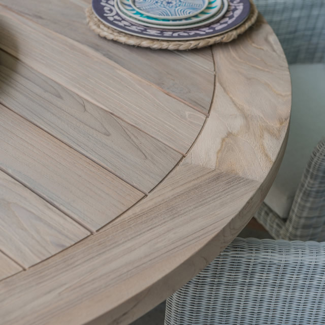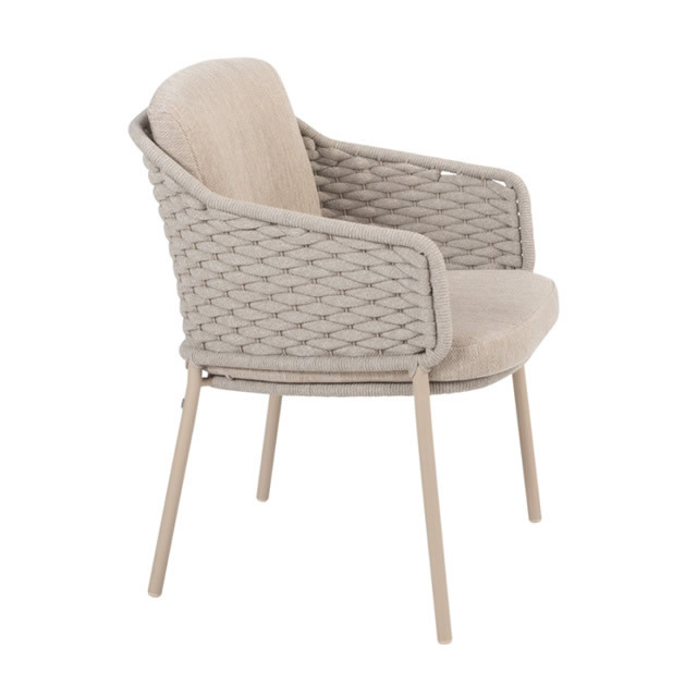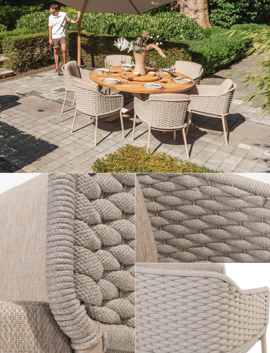EROS(エロス)のガーデンチェアーは、背面にもクッションが付属し、包み込まれるようなロープ素材が特徴のガーデンチェアーです。セットなるLOUVRE(ルーブル)のチークオーバルテーブルは、直径160cmのゆとりの天板でダイニングチェアー6脚で囲むにも十分なサイズのガーデンテーブルです。