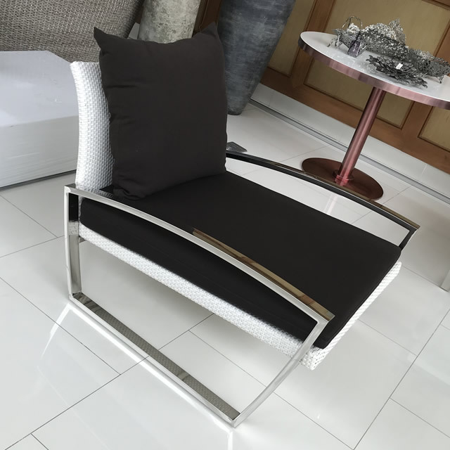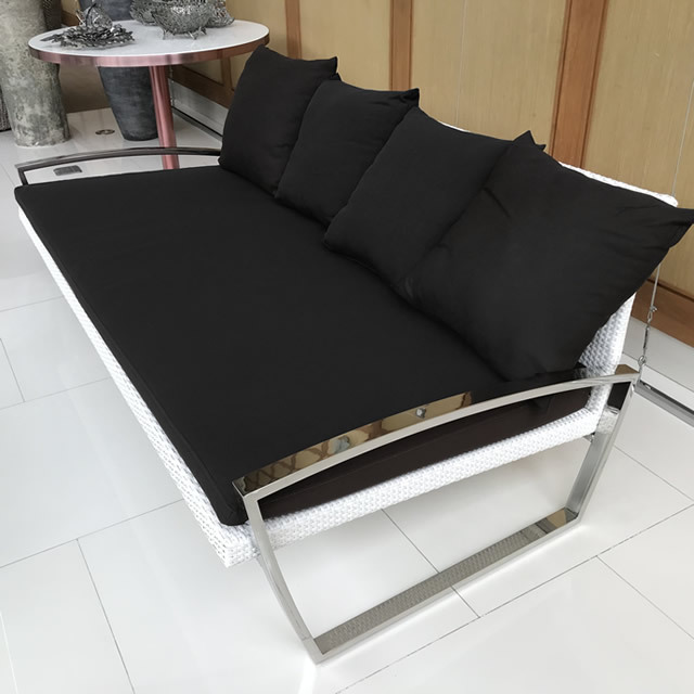 シャープなデザインが印象的な、ステンレスと人工ラタンのリゾートソファ家具